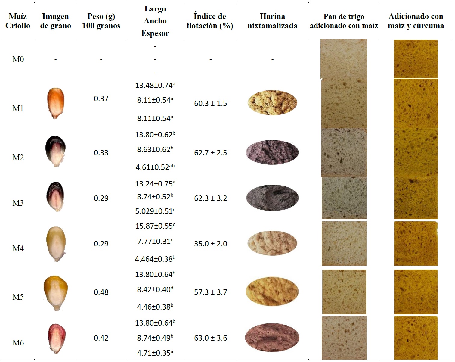 Colorimetric characterization, texture and sanitary quality of breads added with Creole corns and Curcuma longa